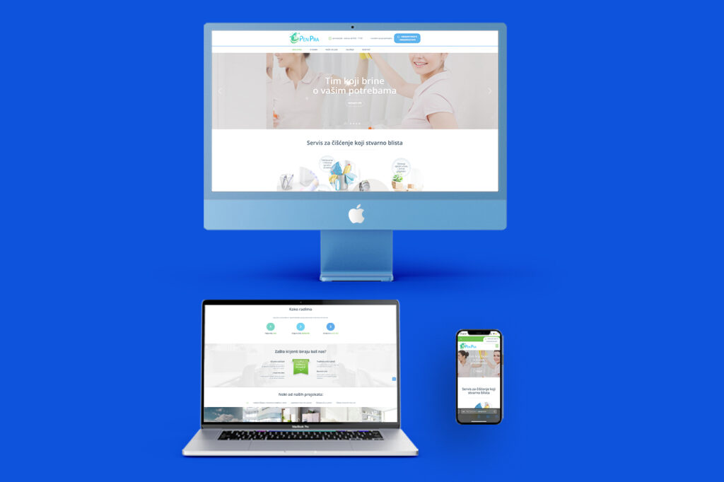 For the mentioned website, the colors from the logo were chosen, with white being dominant color , which indicates purity and also the main activity. Leave those rags and vacuum cleaners, dial the number (link contact) and "buy" yourself some time to relax or to create a responsive and modern website that will improve your business.